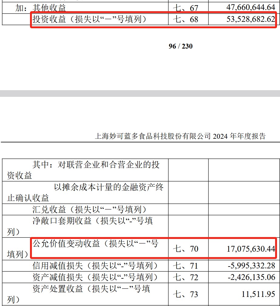 2024年,妙可蓝多营业收入48.44亿元,同比下滑8.99%;归母净利润1.14亿元,同比增长89.16%;扣非净利润激增554.27%至4692万元。这份“减收增利”财报高度依赖非经常性损益:公允价值变动收益占净利润15%,投资收益占比高达47%。扣非净利润仅4692万元,与归母净利润相差6670万元,表明公司核心业务盈利能力不足。
