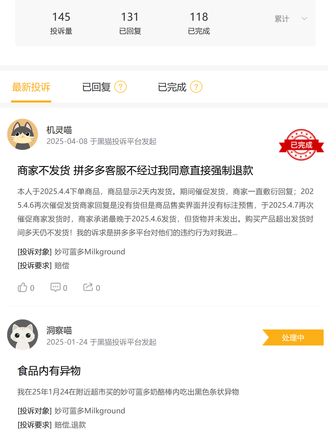 黑猫投诉平台上,以“妙可蓝多”为关键词的过百条投诉中,不少关于产品异物、变质的投诉指向公司品控短板。