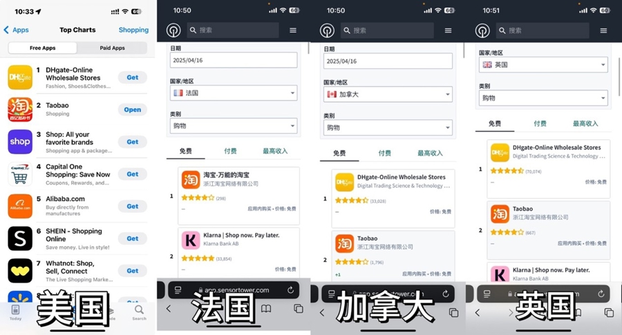 美国应用商店的蹿红,也带火了其他国家和地区的排行榜。截至4月16日,淘宝在加拿大、英国等国家应用商店榜单上升至第二,在法国市场排名第一,下载量较关税风波前大幅上升。