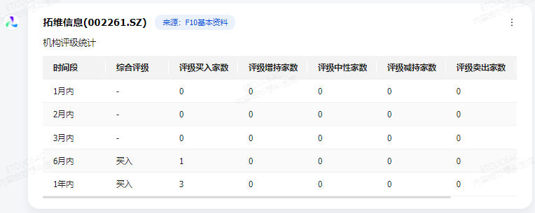 截至2025年4月17日,拓维信息(002261.SZ)在近1月内、近2月内、近3月内均未有机构给出评级。然而,在近6月内,有1家机构给予“买入”评级;在近1年内,共有3家机构给予“买入”评级。