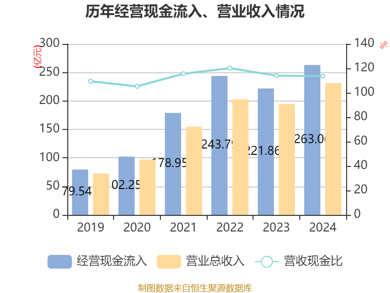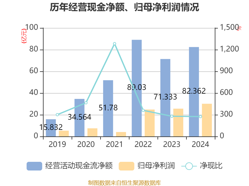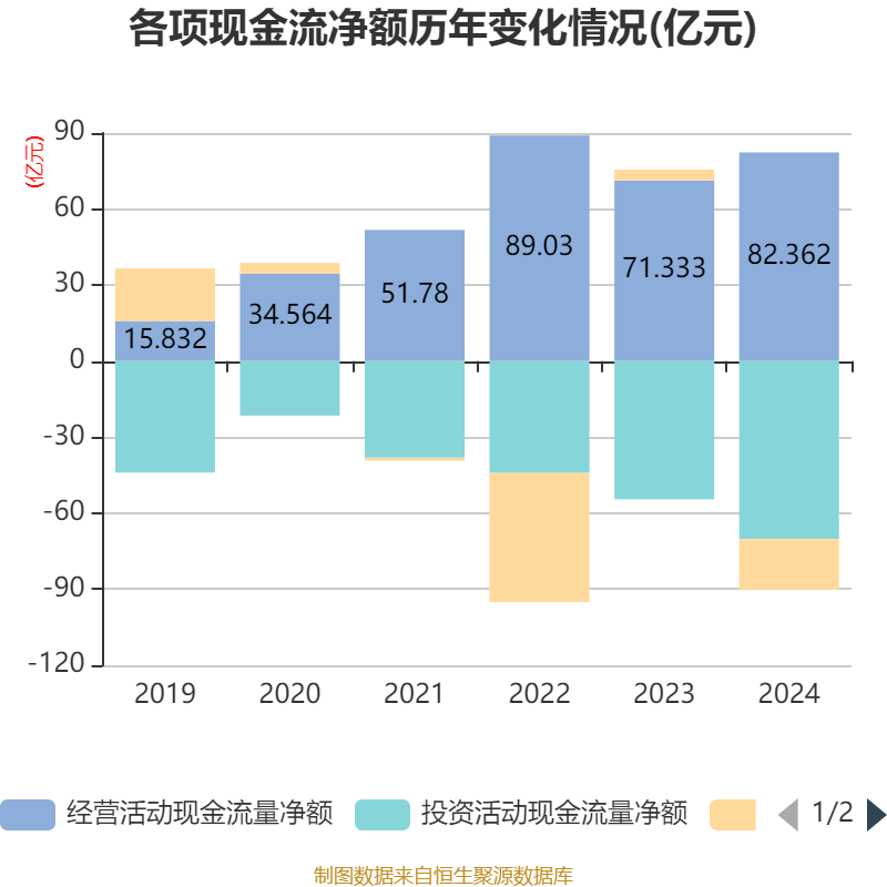 截至2024年,公司经营活动现金流净额为82.36亿元,同比增长15.46%;筹资活动现金流净额-20.1亿元,同比减少24.36亿元;投资活动现金流净额-70.2亿元,上年同期为-54.53亿元。