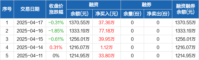 融资方面,当日融资买入293.98万元,融资偿还256.62万元,融资净买入37.36万元,连续5日净买入累计189.41万元。融券方面,融券卖出0份,融券偿还0份,融券余量0份,融券余额0元。融资融券余额合计1370.55万元。