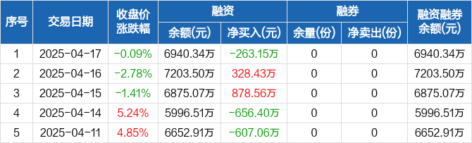 融资方面,当日融资买入5584.9万元,融资偿还5848.05万元,融资净偿还263.15万元。融券方面,融券卖出0份,融券偿还0份,融券余量0份,融券余额0元。融资融券余额合计6940.34万元。
