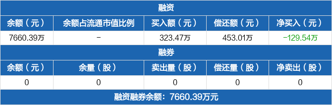 融资方面,当日融资买入323.47万元,融资偿还453.01万元,融资净偿还129.54万元。融券方面,融券卖出0份,融券偿还0份,融券余量0份,融券余额0元。融资融券余额合计7660.39万元。