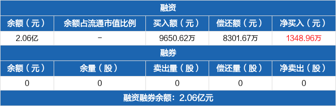 融资方面,当日融资买入9650.62万元,融资偿还8301.67万元,融资净买入1348.96万元。融券方面,融券卖出0份,融券偿还0份,融券余量0份,融券余额0元。融资融券余额合计2.06亿元。