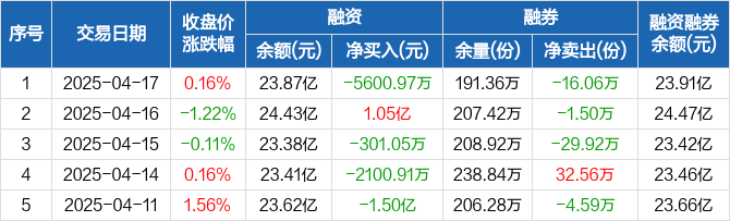 融资方面,当日融资买入3.97亿元,融资偿还4.54亿元,融资净偿还5600.97万元。融券方面,融券卖出18.37万份,融券偿还34.43万份,融券余量191.36万份,融券余额358.42万元。融资融券余额合计23.91亿元。