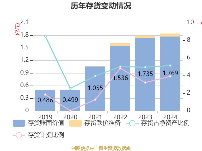 从存货变动来看,截至2024年末,公司存货账面价值为1.77亿元,占净资产的5.13%,较上年末增加334.58万元。其中,存货跌价准备为720.05万元,计提比例为3.91%。