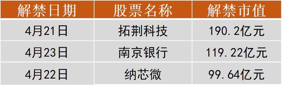 Wind数据显示,本周(4月21日—4月25日)将有33只股票面临限售股解禁,合计解禁量为38.92亿股。按4月18日收盘价计算,合计解禁市值为840.58亿元。其中,解禁市值居前三位的是:拓荆科技(190.2亿元)、南京银行(119.22亿元)、纳芯微(99.64亿元)。
