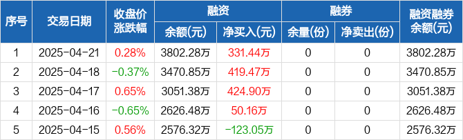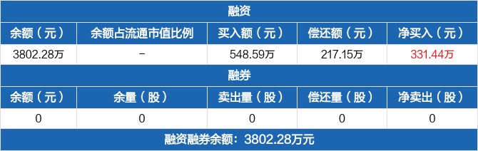 融资方面,当日融资买入548.59万元,融资偿还217.15万元,融资净买入331.44万元,连续4日净买入累计1225.96万元。融券方面,融券卖出0份,融券偿还0份,融券余量0份,融券余额0元。融资融券余额合计3802.28万元。