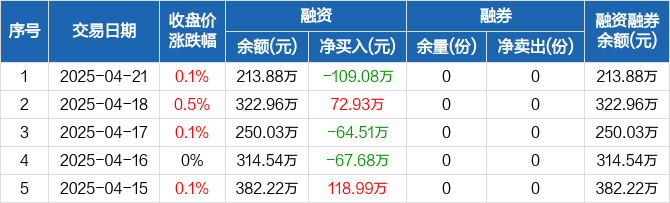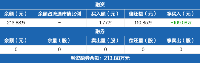 融资方面,当日融资买入1.77万元,融资偿还110.85万元,融资净偿还109.08万元。融券方面,融券卖出0份,融券偿还0份,融券余量0份,融券余额0元。融资融券余额合计213.88万元。