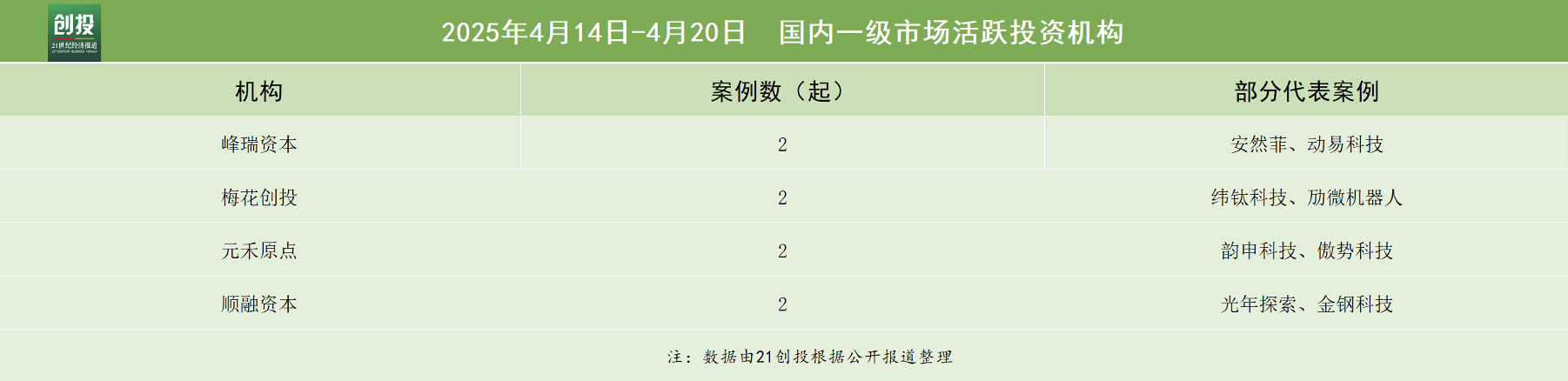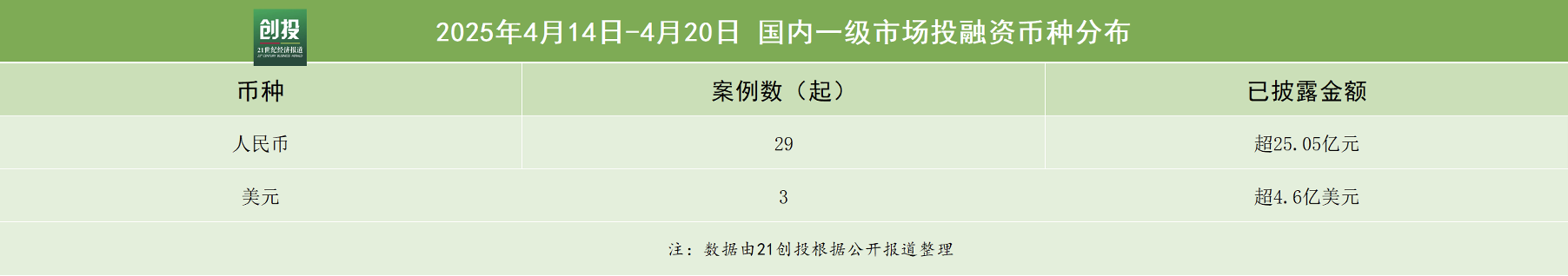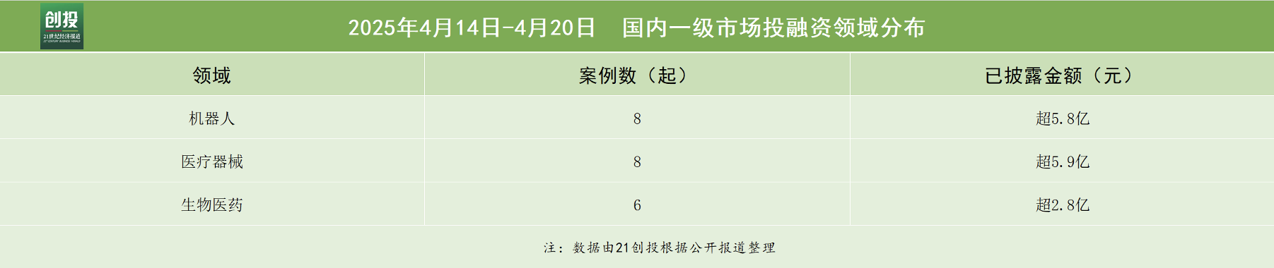 21创投不完全统计,4月14日—4月20日,报告日期内国内一级市场发生融资事件39起。其中,有32笔融资披露了融资金额和币种信息,总规模约合人民币57.45亿元。