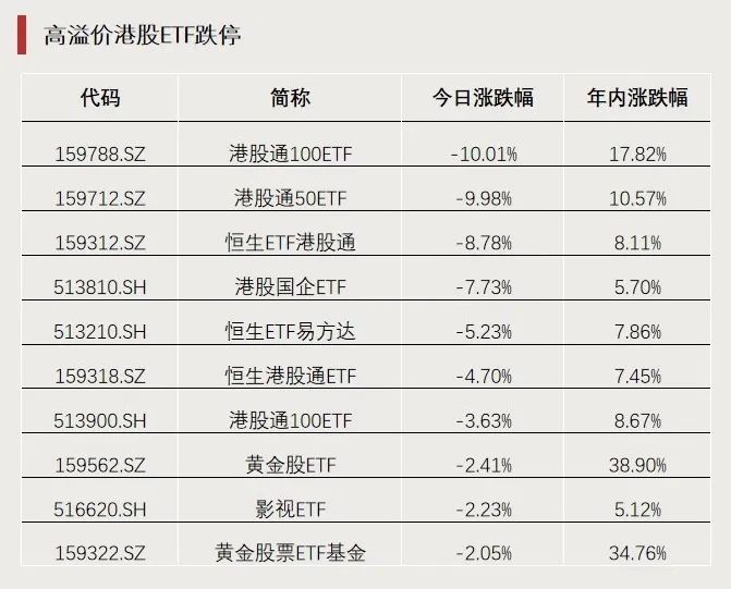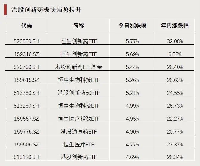 港股创新药板块持续活跃,多只港股医药主题ETF涨超5%。今年以来,港股医药主题ETF累计涨幅普遍超20%,位居行业前列。此前港股休市时大幅溢价的港股通100ETF(159788)、港股通50ETF(159712)今日跌停。