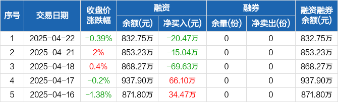 融资方面,当日融资买入9.25万元,融资偿还29.72万元,融资净偿还20.47万元,连续3日净偿还累计105.14万元。融券方面,融券卖出0份,融券偿还0份,融券余量0份,融券余额0元。融资融券余额合计832.75万元。