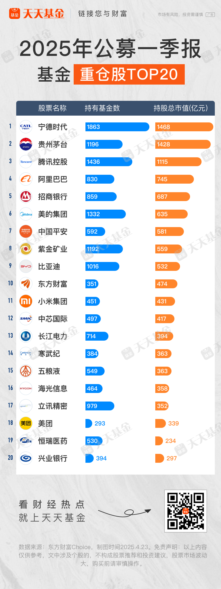 随着2025年基金一季报披露完毕,公募重仓股情况新鲜出炉。
