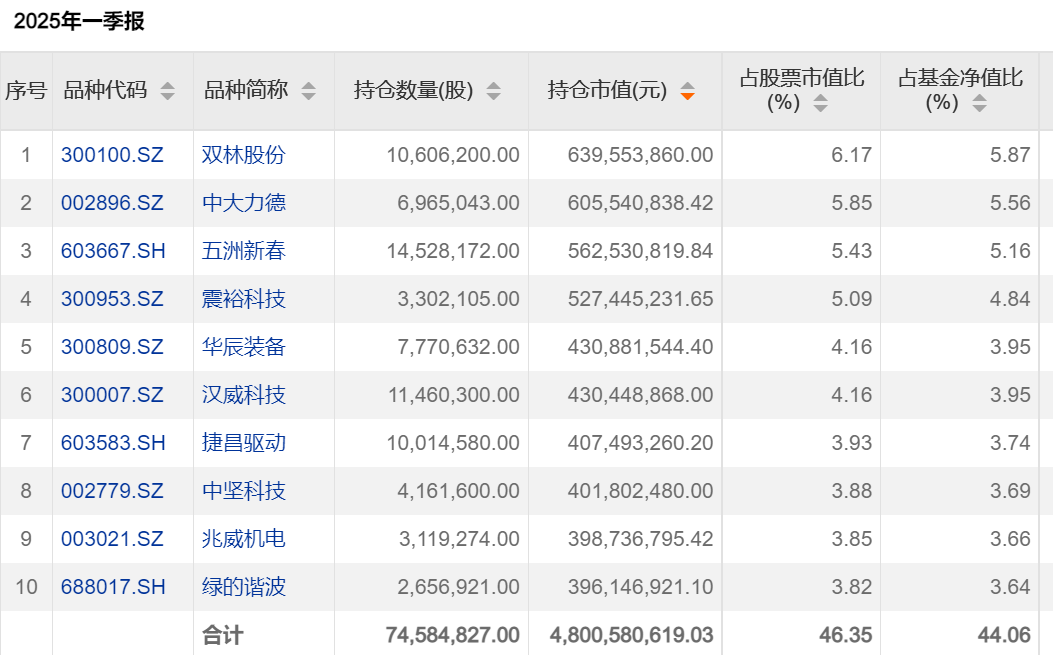 截至3月底,鹏华碳中和主题混合基金的权益投资占基金资产净值比例达到95.06%。前十大重仓股分别为双林股份、中大力德、五洲新春、震裕科技、华辰装备、汉威科技、捷昌驱动、中坚科技、兆威机电、绿的谐波。