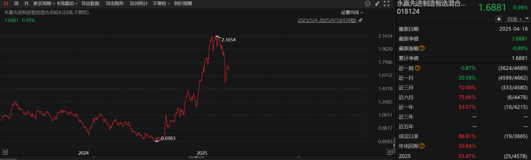 永赢先进制造智选混合基金净值同样剧烈波动。该基金2023年5月成立,去年8月底,基金净值一度跌至不足0.7元,此后基金净值大幅攀升至2.1654元。截至4月18日,最新基金净值回落至1.6881元。