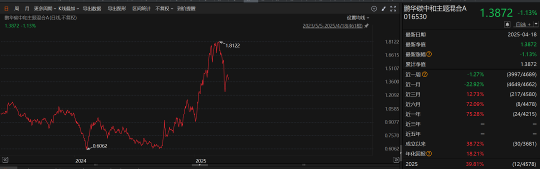 从鹏华碳中和主题混合基金的净值表现来看,波动十分剧烈。该基金于2023年5月成立,去年9月,基金净值一度跌至0.6134元,此后基金净值强势反弹,截至2025年3月20日,基金净值一度高达1.8122元。近期,市场有所调整,该基金净值大幅回落至1.3872元。
