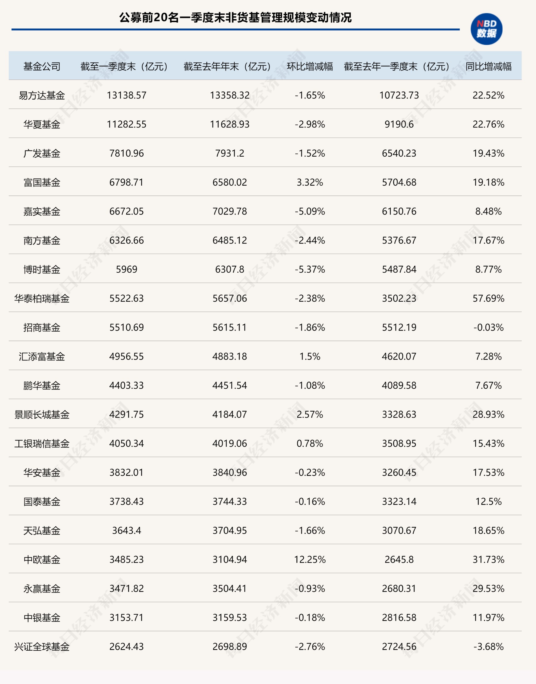 根据Wind数据,《每日经济新闻》记者统计了全市场162家公募持牌机构与去年年末和去年一季度相比,非货基管理规模的变动情况,排名前20的公司具体如下: