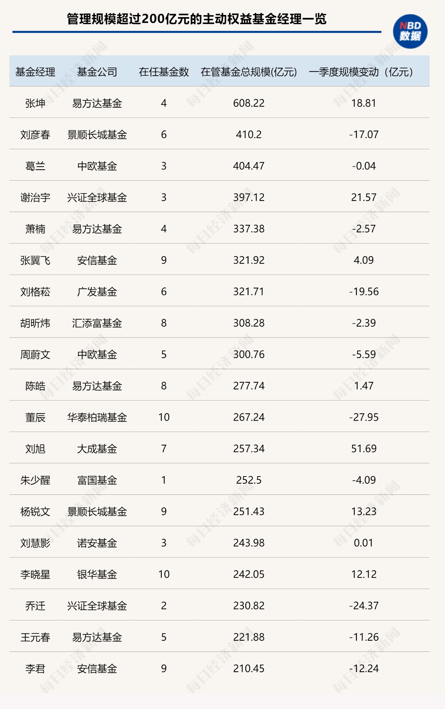随着公募基金一季报披露完毕,各家基金公司和基金经理的管理规模也浮出水面。