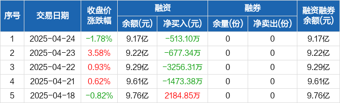 融资方面,当日融资买入8456.14万元,融资偿还8969.24万元,融资净偿还513.1万元,连续4日净偿还累计5920.13万元。融券方面,融券卖出0份,融券偿还0份,融券余量0份,融券余额0元。融资融券余额合计9.17亿元。