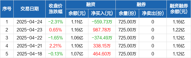 融资方面,当日融资买入1469.58万元,融资偿还2029.31万元,融资净偿还559.73万元。融券方面,融券卖出0份,融券偿还0份,融券余量725万份,融券余额551.73万元。融资融券余额合计1.16亿元。
