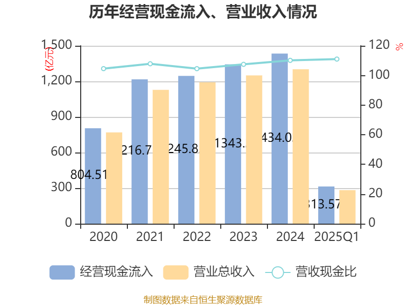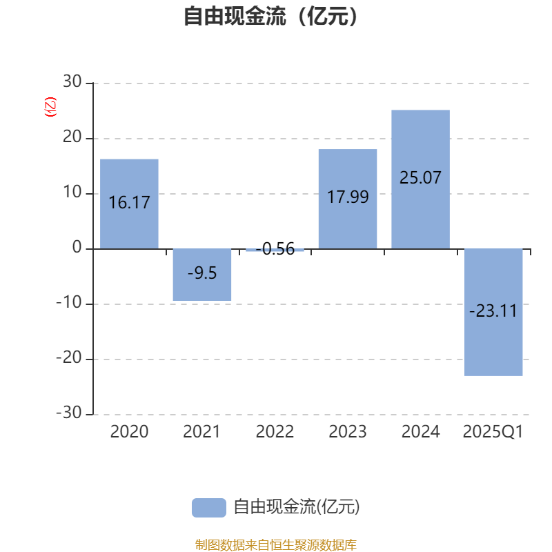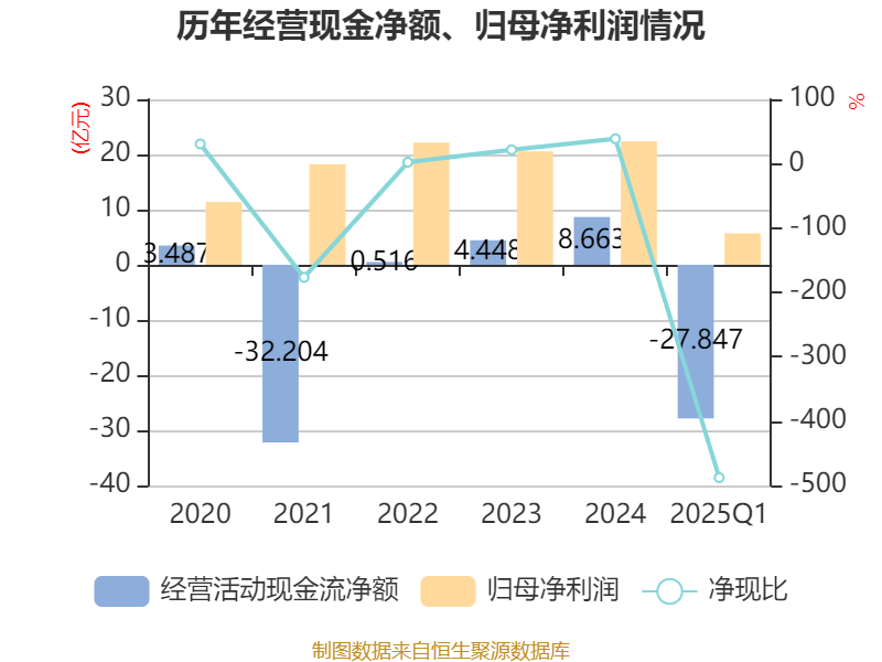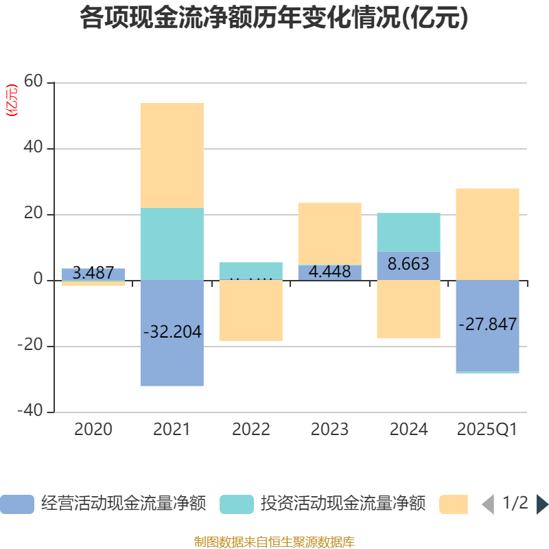 截至2025年一季度末,公司经营活动现金流净额为-27.85亿元,同比增加29.98亿元;筹资活动现金流净额27.77亿元,同比减少19.98亿元;投资活动现金流净额-5235.11万元,上年同期为-5834.6万元。