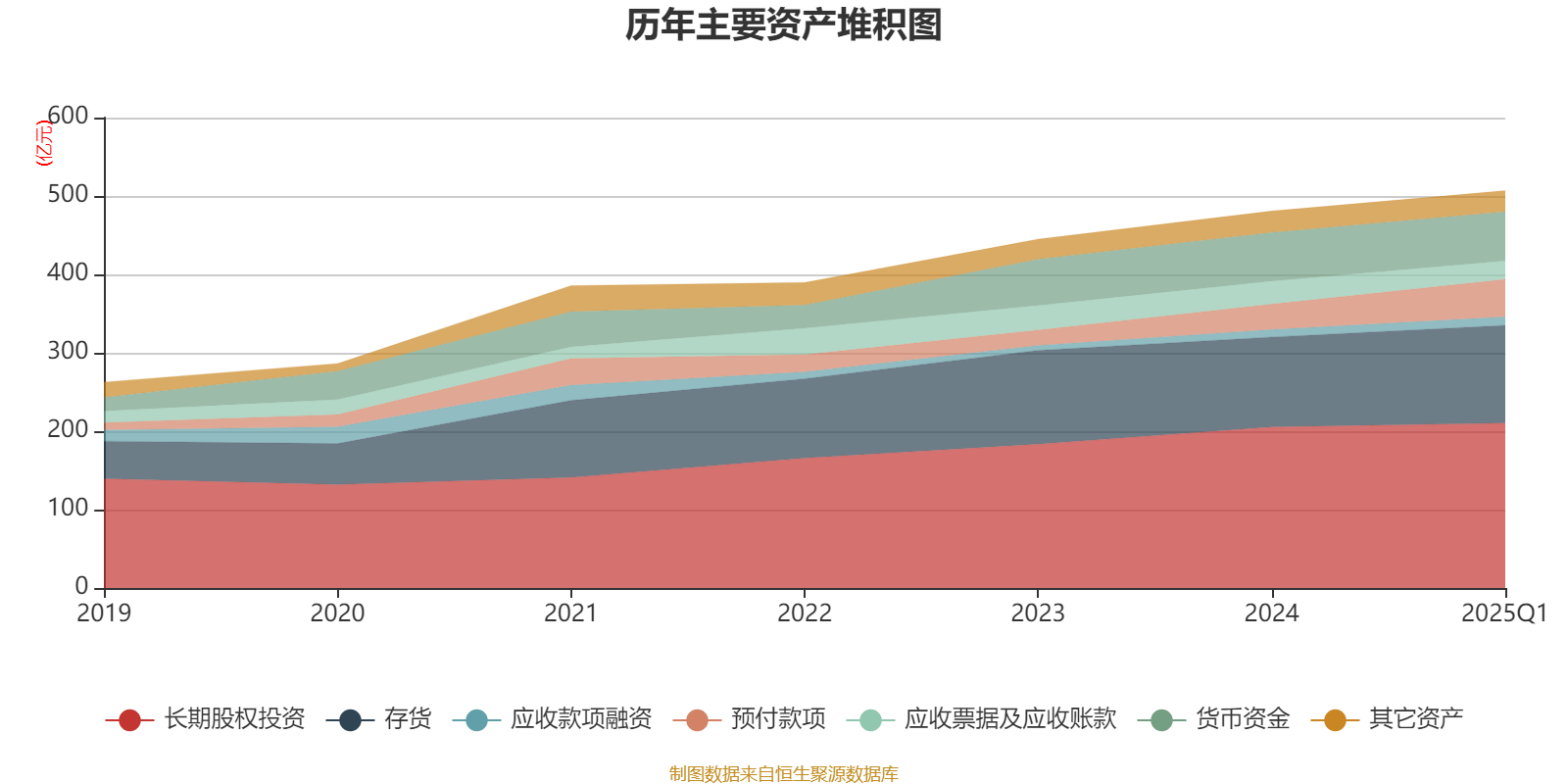 资产重大变化方面,截至2025年一季度末,公司预付款项较上年末增加47.06%,占公司总资产比重上升2.67个百分点;衍生金融资产较上年末减少79.34%,占公司总资产比重下降1.62个百分点;应收票据及应收账款较上年末减少19.52%,占公司总资产比重下降1.44个百分点;长期股权投资较上年末增加2.45%,占公司总资产比重下降1.18个百分点。