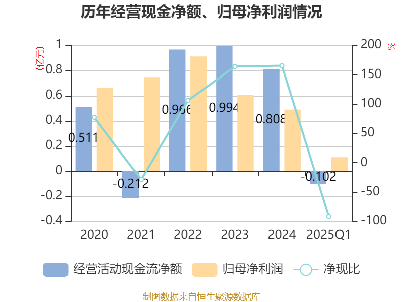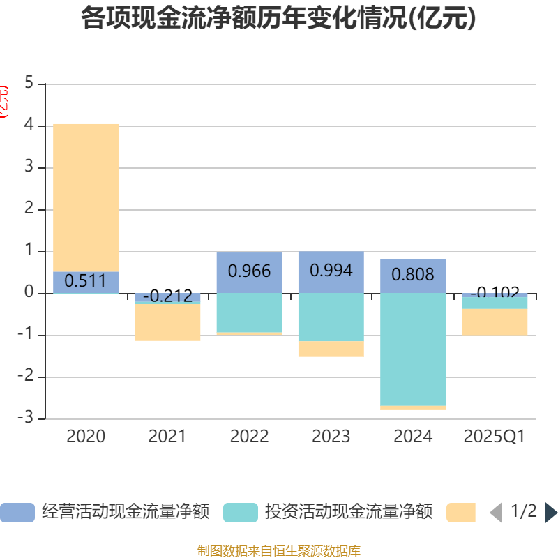 截至2025年一季度末,公司经营活动现金流净额为-1020.01万元,同比减少822.88万元;筹资活动现金流净额-6445.03万元,同比减少5985.62万元;投资活动现金流净额-2792.82万元,上年同期为-3183.13万元。