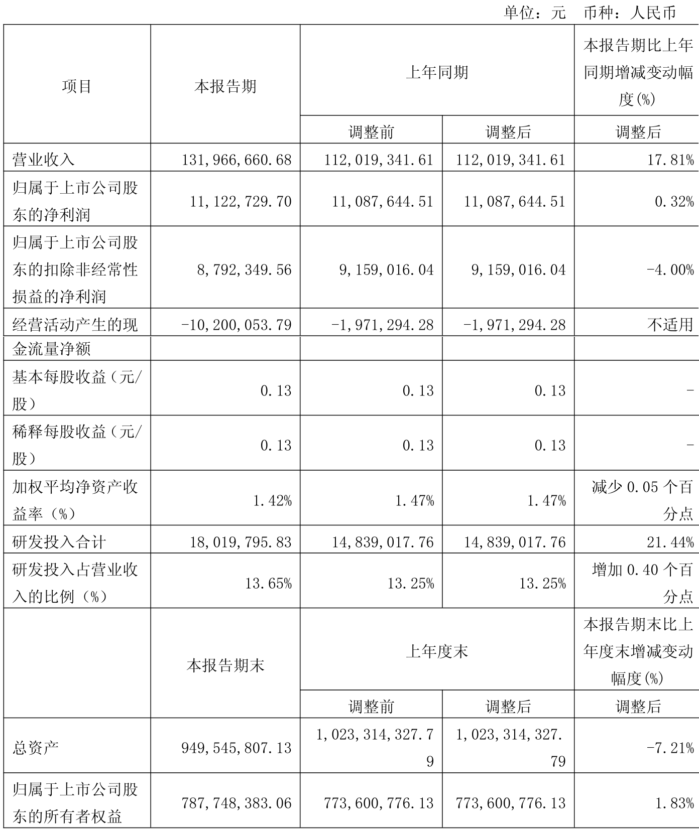 中证智能财讯步科股份(688160)4月25日披露2025年第一季度报告。公司实现营业总收入1.32亿元,同比增长17.81%;归母净利润1112.27万元,同比增长0.32%;扣非净利润879.23万元,同比下降4.00%;经营活动产生的现金流量净额为-1020.01万元,上年同期为-197.13万元;报告期内,步科股份基本每股收益为0.13元,加权平均净资产收益率为1.42%。
