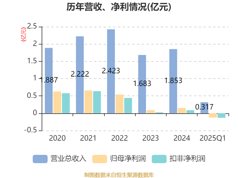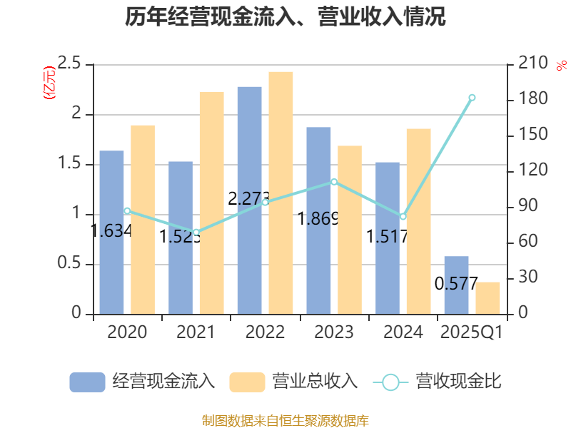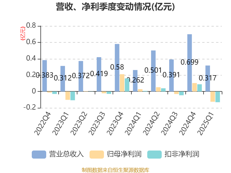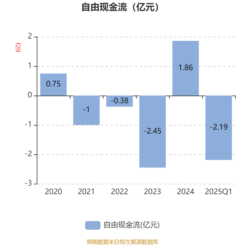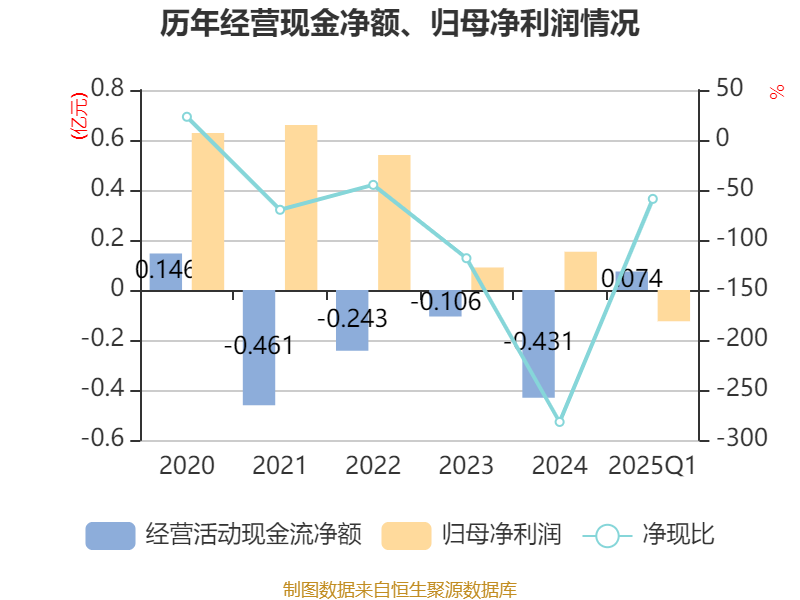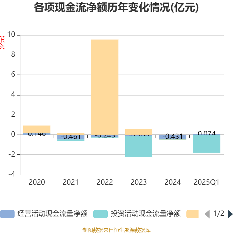 截至2025年一季度末,公司经营活动现金流净额为738.57万元,同比增加1818.54万元;筹资活动现金流净额-160.17万元,同比增加1993.18万元;投资活动现金流净额-1.8亿元,上年同期为9537.85万元。
