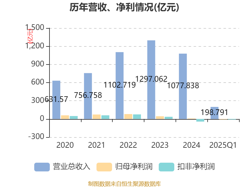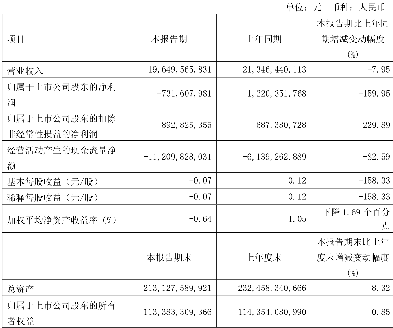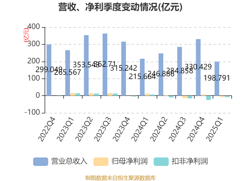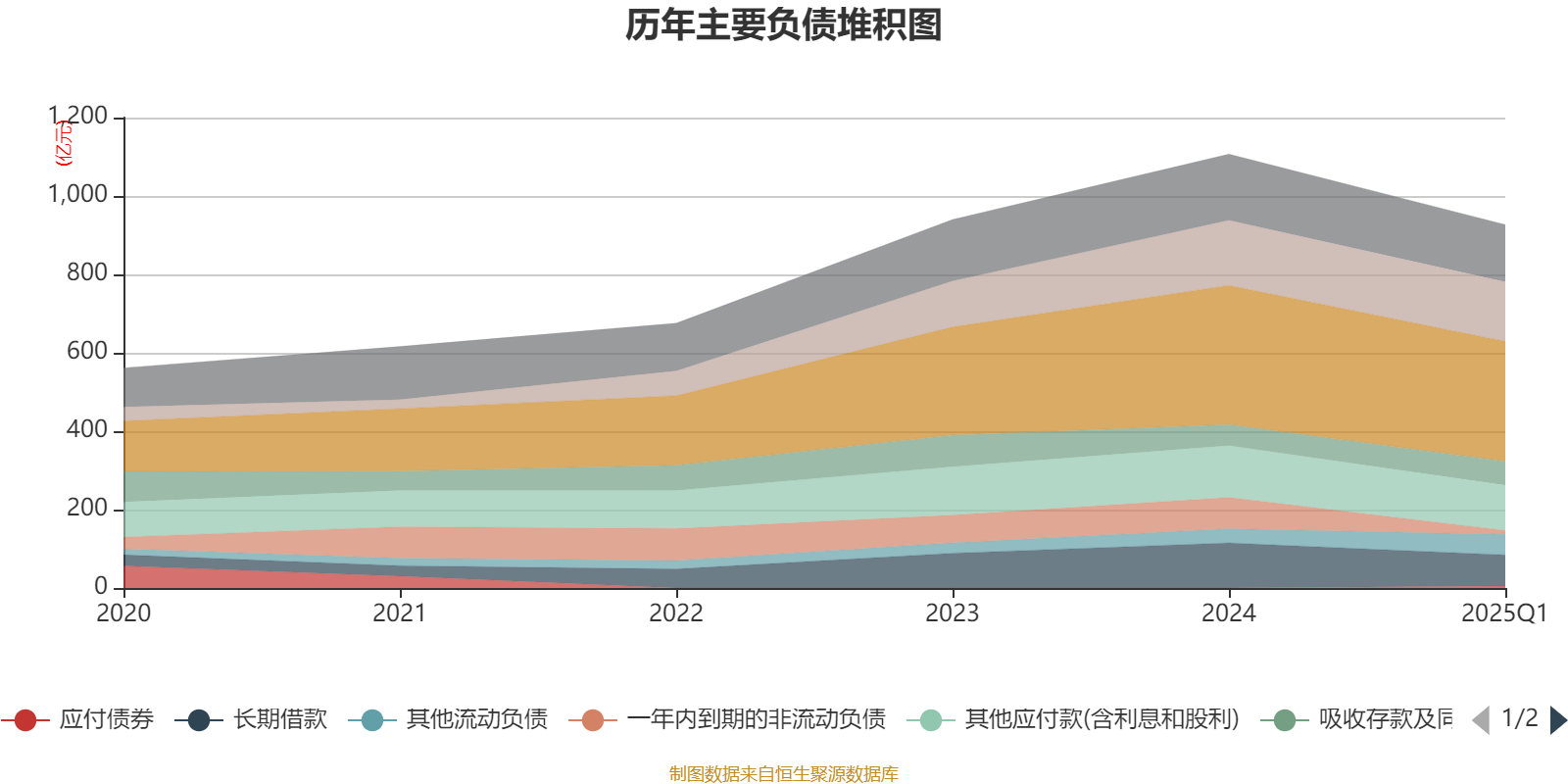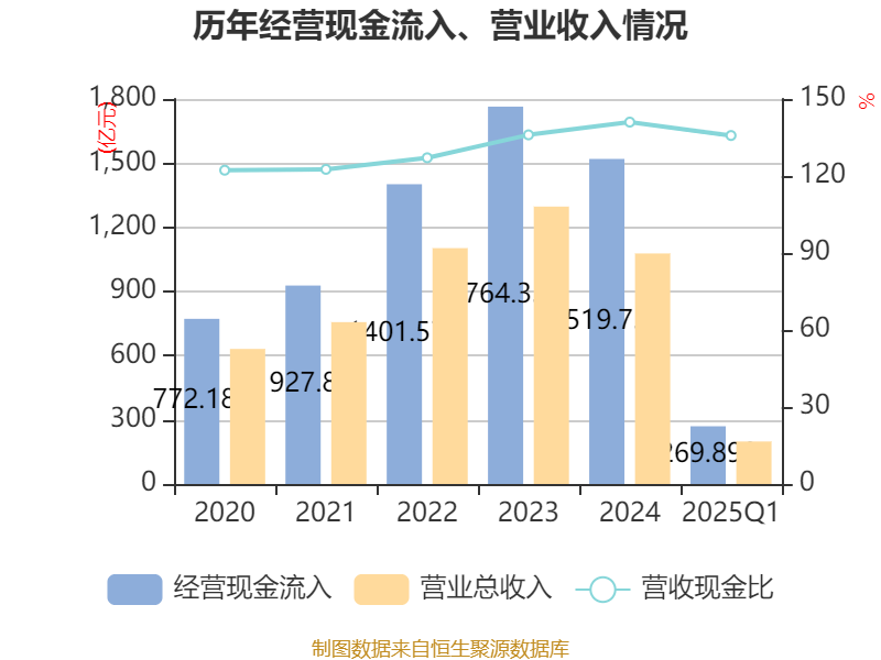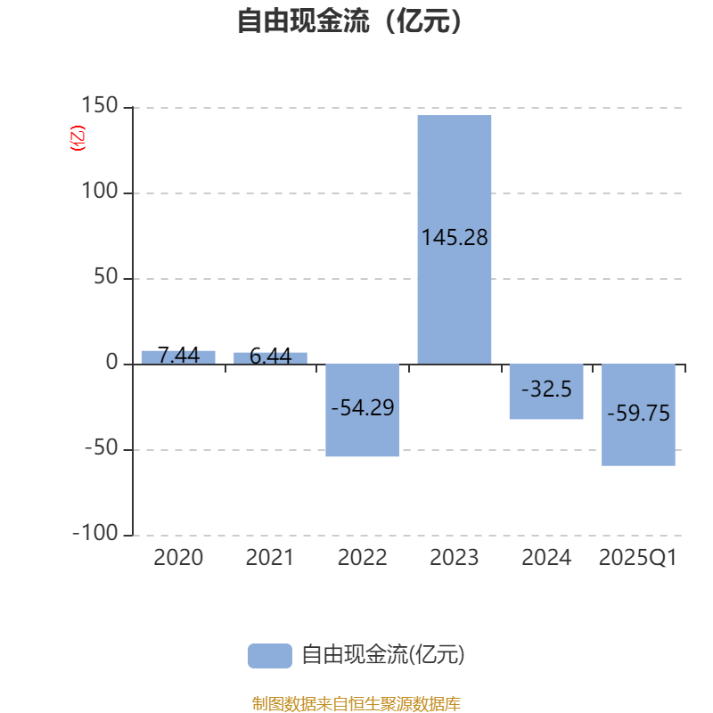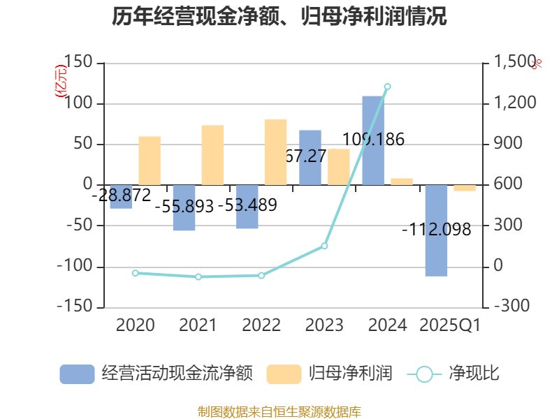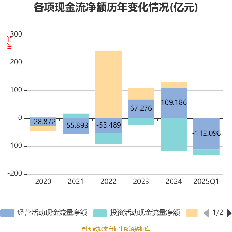 截至2025年一季度末,公司经营活动现金流净额为-112.1亿元,同比减少50.71亿元;筹资活动现金流净额1.34亿元,同比减少19.54亿元;投资活动现金流净额-20.23亿元,上年同期为-43.86亿元。