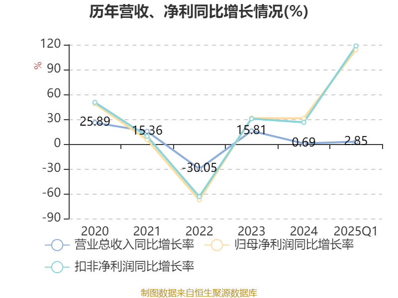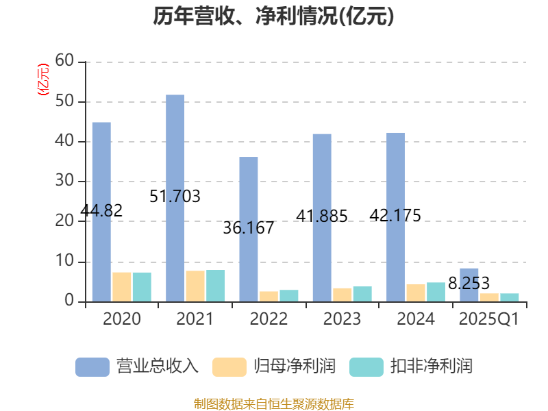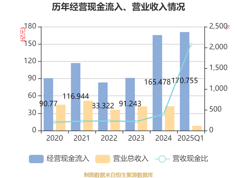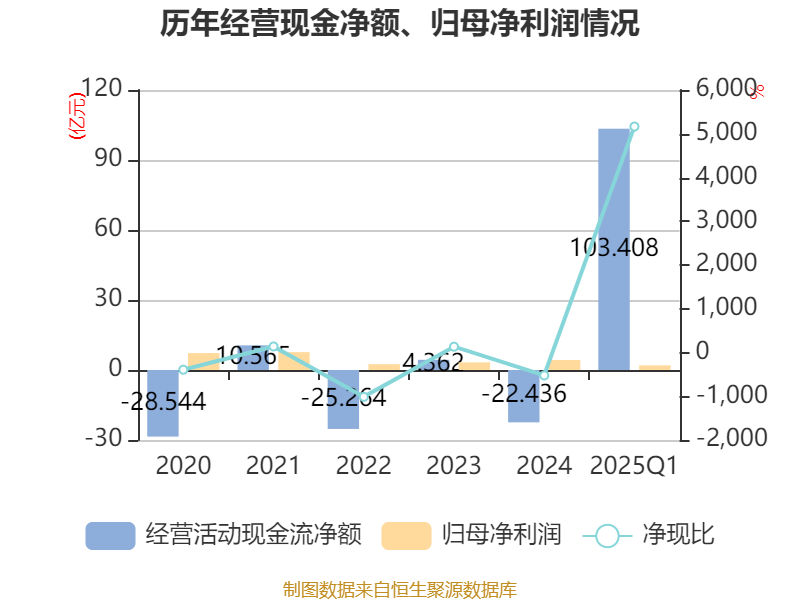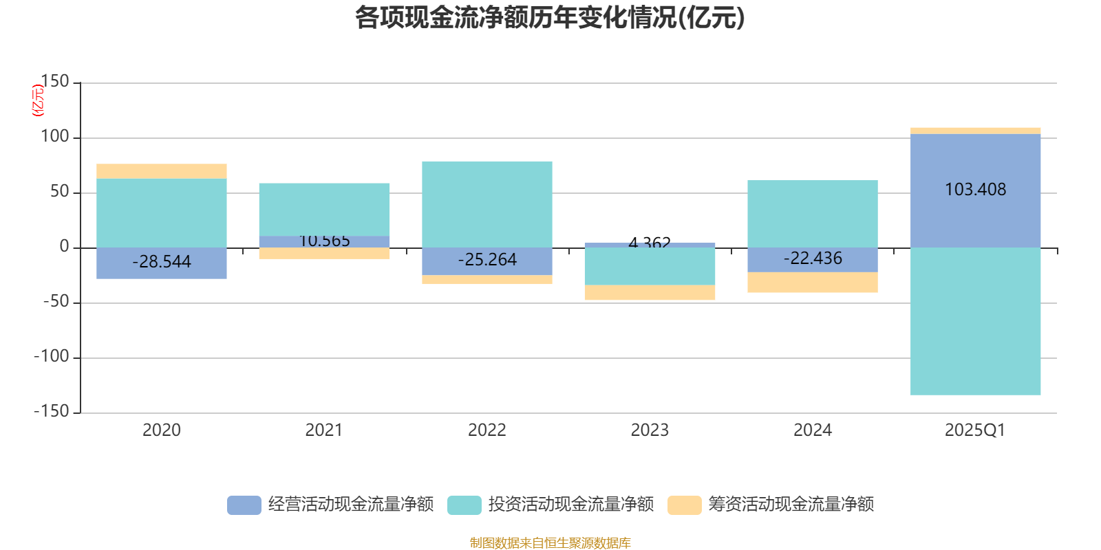 截至2025年一季度末,公司经营活动现金流净额为103.41亿元,同比下降20.61%;筹资活动现金流净额5.53亿元,同比增加18.26亿元;投资活动现金流净额-134.24亿元,上年同期为-109.97亿元。