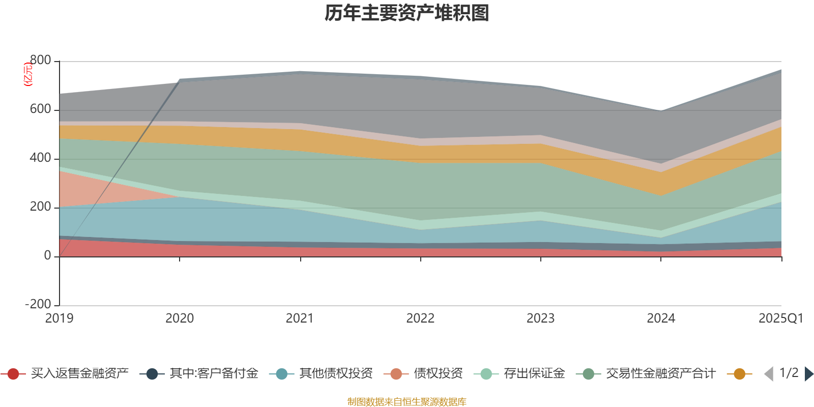 资产重大变化方面,截至2025年一季度末,公司其他债权投资较上年末增加511.91%,占公司总资产比重上升16.61个百分点;货币资金较上年末减少10.69%,占公司总资产比重下降10.84个百分点;融出资金较上年末增加3.2%,占公司总资产比重下降3.18个百分点;结算备付金较上年末减少10.77%,占公司总资产比重下降1.79个百分点。