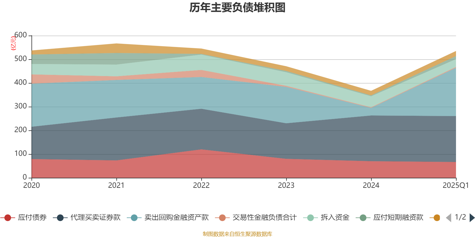 负债重大变化方面,截至2025年一季度末,公司卖出回购金融资产款较上年末增加535.07%,占公司总资产比重上升21.27个百分点;代理买卖证券款较上年末增加0.41%,占公司总资产比重下降7.07个百分点;拆入资金较上年末减少29.48%,占公司总资产比重下降3.54个百分点;应付债券较上年末减少4.89%,占公司总资产比重下降3.04个百分点。