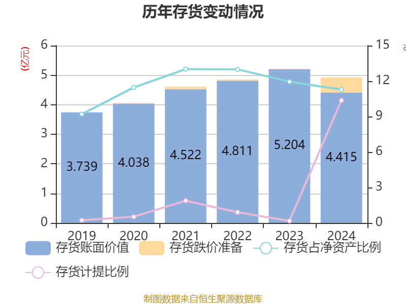 从存货变动来看,截至2024年末,公司存货账面价值为4.41亿元,占净资产的11.28%,较上年末减少7891.61万元。其中,存货跌价准备为5101.84万元,计提比例为10.36%。