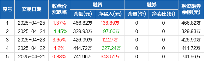 融资方面,当日融资买入446.02万元,融资偿还309.13万元,融资净买入136.89万元。融券方面,融券卖出0份,融券偿还0份,融券余量0份,融券余额0元。融资融券余额合计466.82万元。