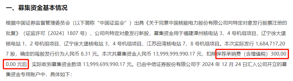 《财中社》注意到,1月22日中国核电(601985)披露的公告显示,中信证券(600030)负责的中国核电140亿元定增项目保荐承销费用也仅为30万元,费率低至0.0021%。由此可见,券商之间投行业务的价格战已成为行业共性难题,甚至从局部竞争蔓延至全领域。