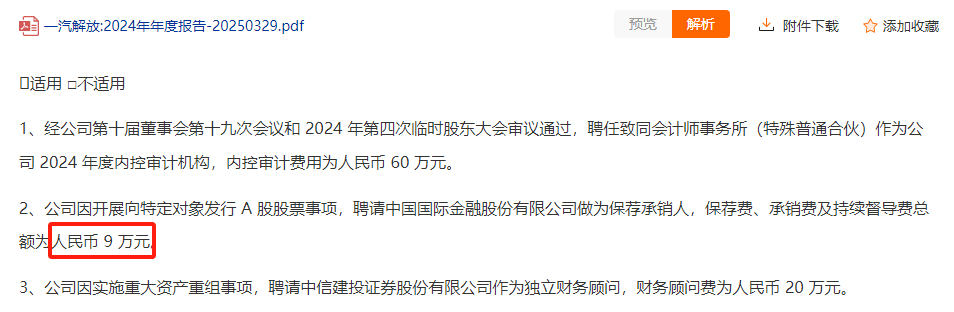 一汽解放(000800)的2024年年报显示,中金公司作为保荐承销人,保荐费、承销费及持续督导费总额为人民币9万元,费率低至 0.005%。有观点认为,中金公司极低费率的背后旨在维系与大型央企的长期合作,为后续并购重组、债券承销等业务奠定基础。不过,这一“地板价”操作不仅刷新了行业下限,更揭开了投行业务持续陷入价格战泥潭的现实。