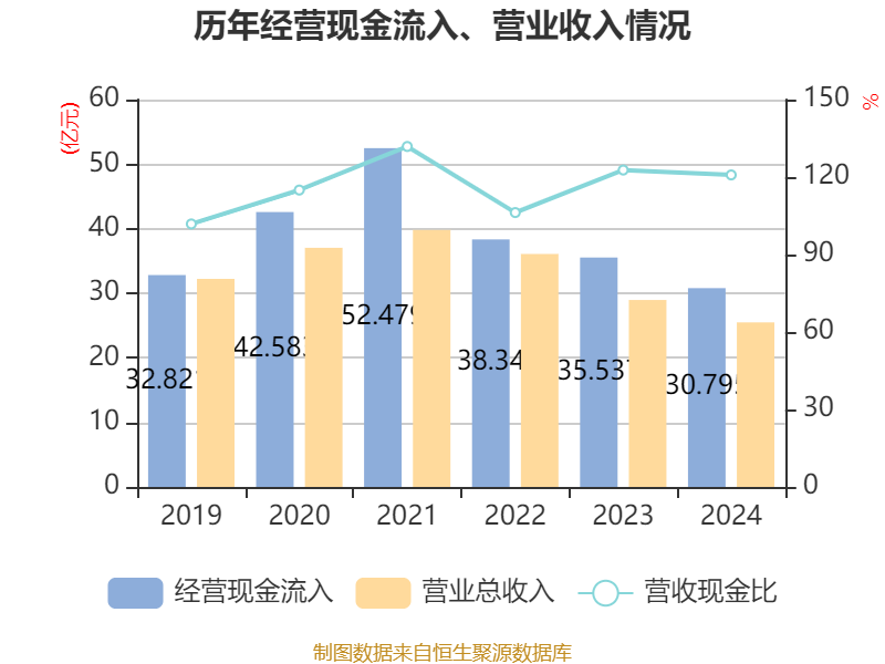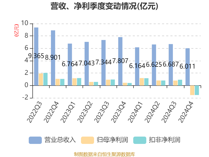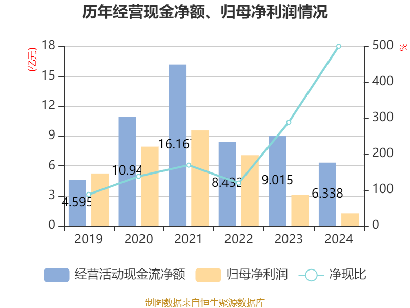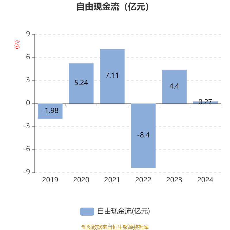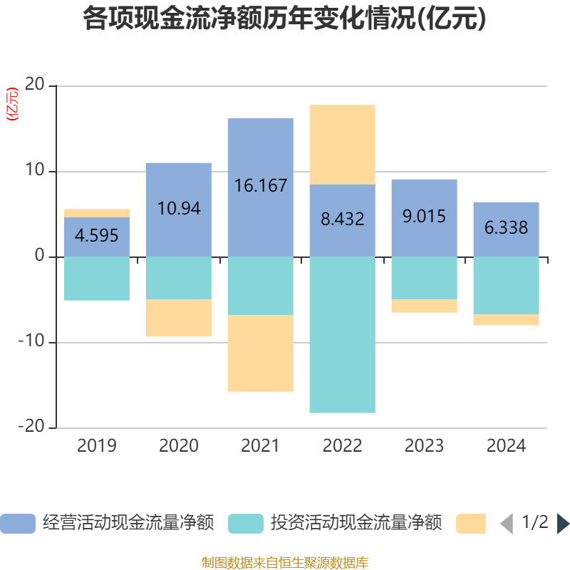 截至2024年,公司经营活动现金流净额为6.34亿元,同比下降29.7%;筹资活动现金流净额-1.27亿元,同比增加2597.23万元;投资活动现金流净额-6.77亿元,上年同期为-5.03亿元。