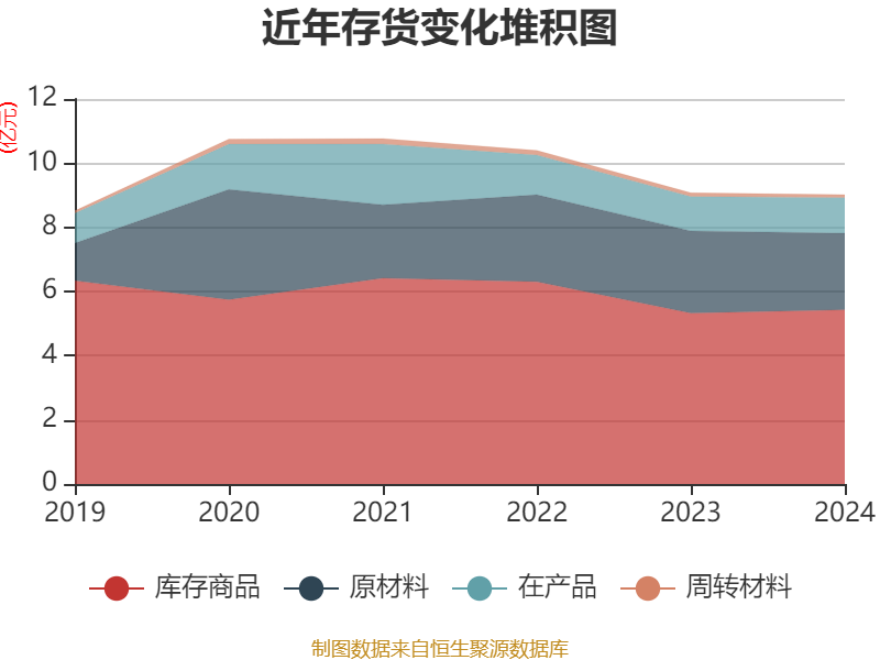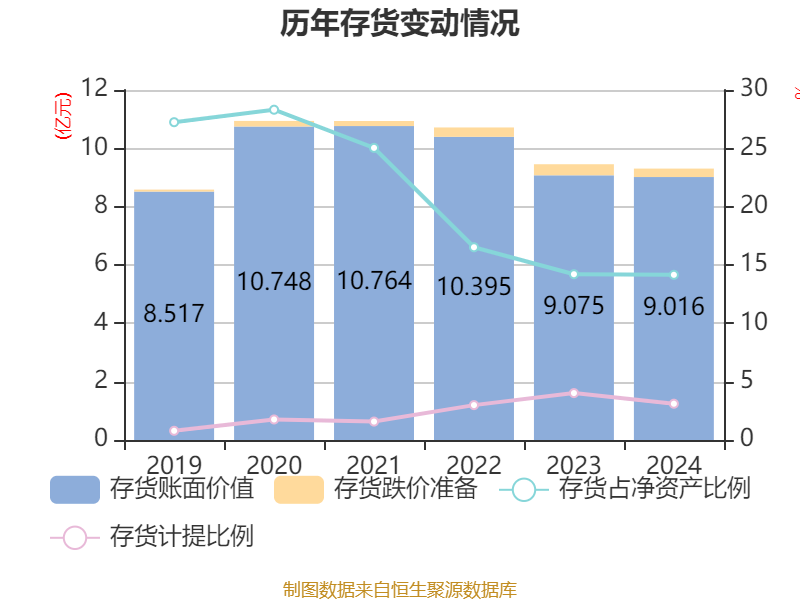 从存货变动来看,截至2024年末,公司存货账面价值为9.02亿元,占净资产的14.16%,较上年末减少591.3万元。其中,存货跌价准备为2898.44万元,计提比例为3.11%。