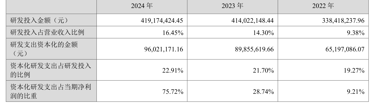 2024年全年,公司研发投入金额为4.19亿元,同比增长1.24%;研发投入占营业收入比例为16.45%,相比上年同期上升2.15个百分点。此外,公司全年研发投入资本化率为22.91%。
