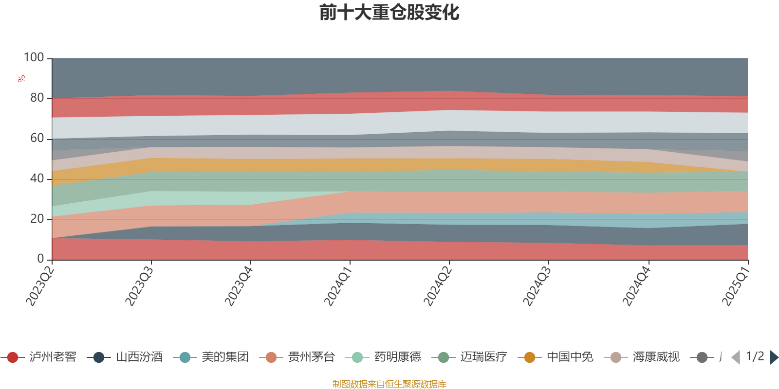 该基金持股集中度较高,且持股标的较为稳定,近2年前十大重仓股集中度长期超过60%。截至2025年一季度末,基金十大重仓股分别是山西汾酒、贵州茅台、五粮液、迈瑞医疗、海大集团、古井贡酒、泸州老窖、美的集团、海康威视、晨光股份。