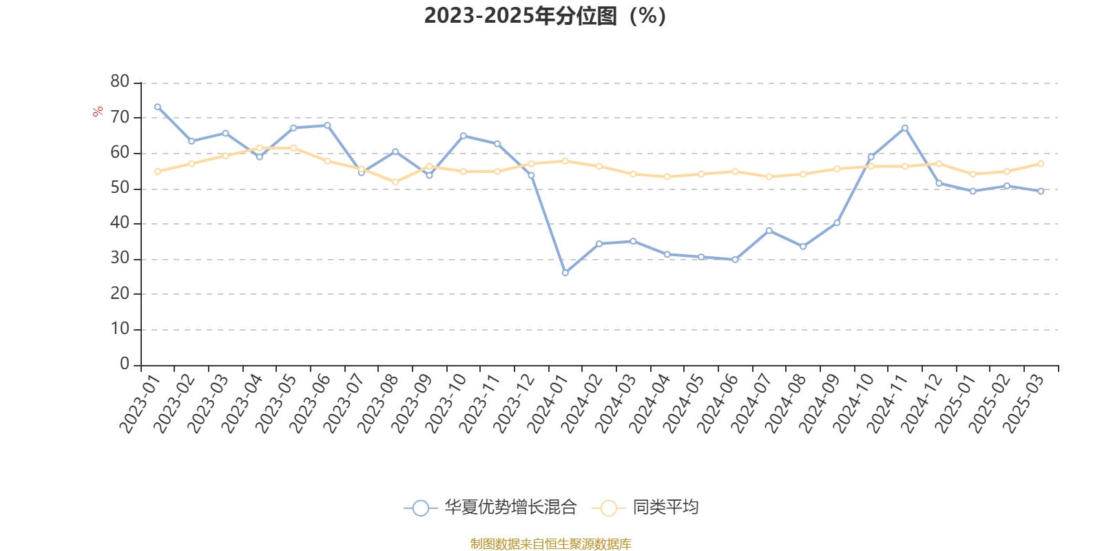 通过所选区间该基金净值增长率分位图,可以观察该基金与同类基金业绩比较情况。图为坐标原点到区间内某时点的净值增长率在同类基金中的分位数。
