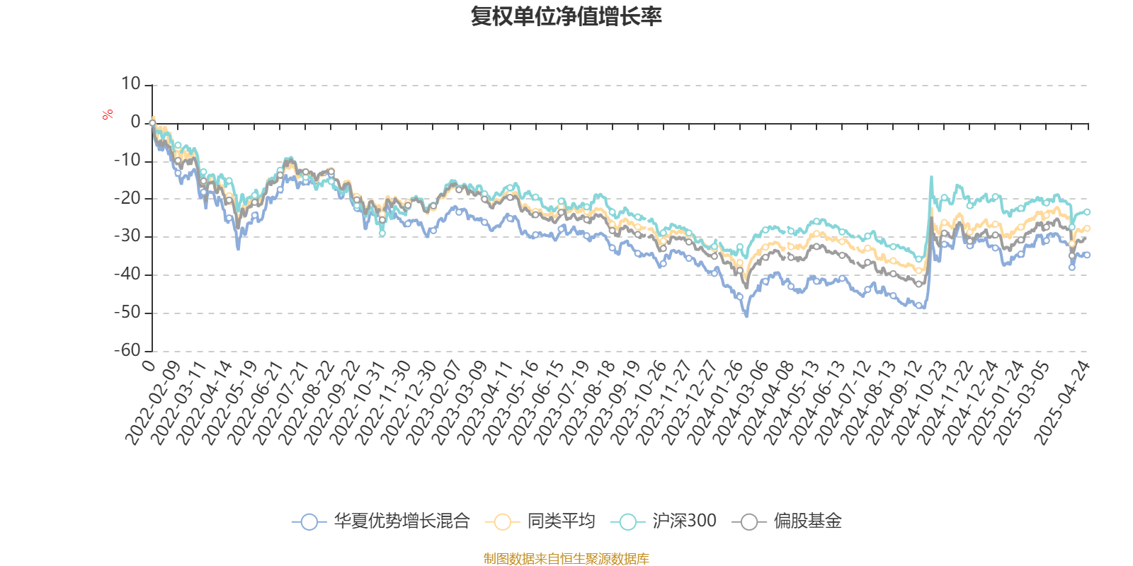 截至4月24日,华夏优势增长混合近三个月复权单位净值增长率为-0.39%,位于同类可比基金76/135;近半年复权单位净值增长率为-3.00%,位于同类可比基金89/135;近一年复权单位净值增长率为15.53%,位于同类可比基金26/135;近三年复权单位净值增长率为-8.61%,位于同类可比基金75/133。