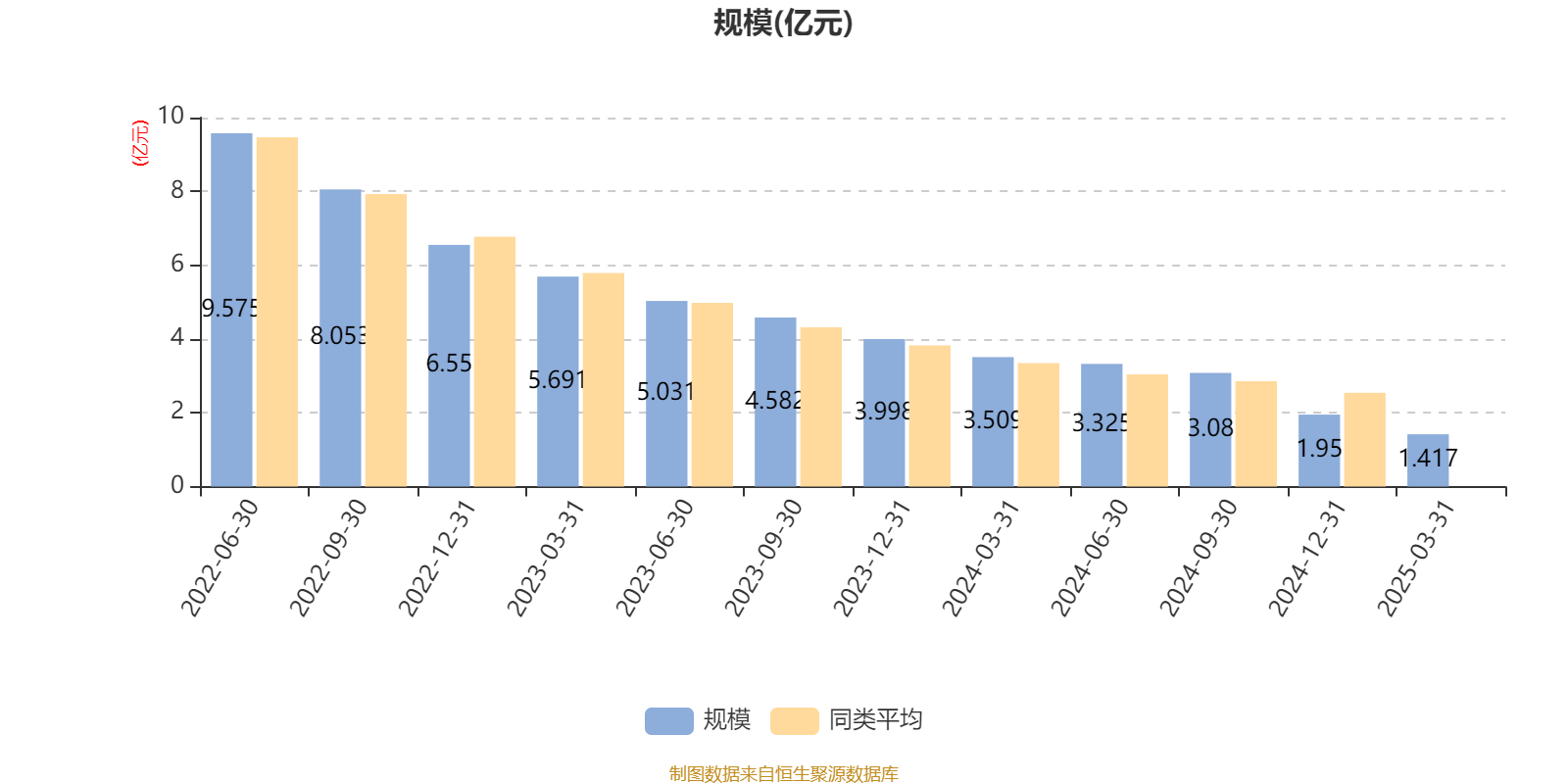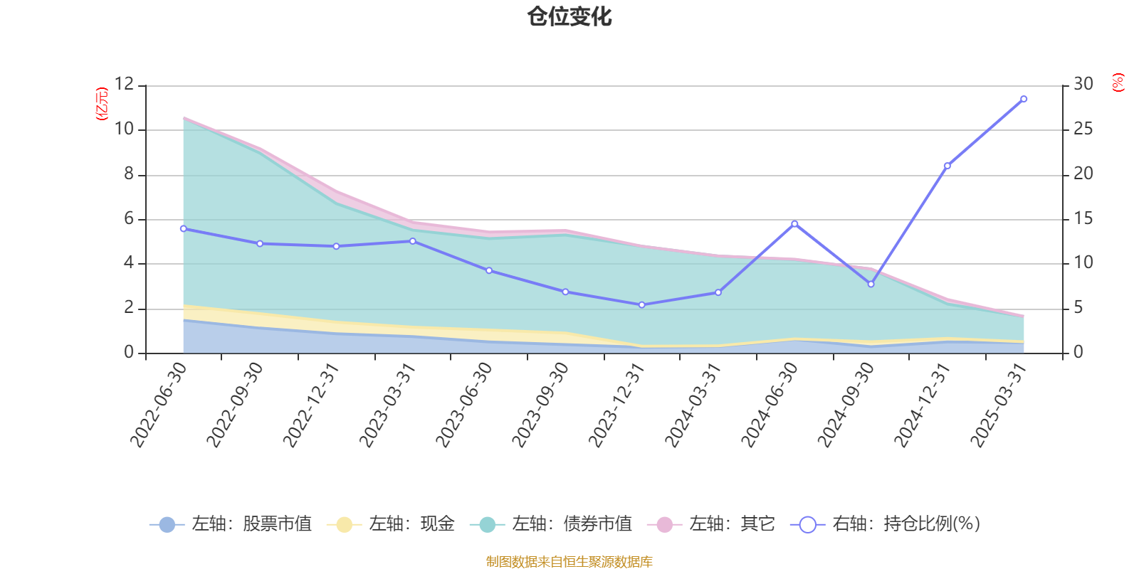 据定期报告数据统计,近三年平均股票仓位为12.56%,同类平均为18.87%。2025年一季度末基金达到28.48%的最高仓位,2023年末最低,为5.41%。