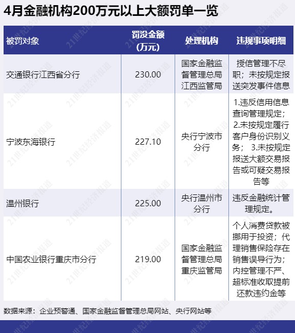 4月金融机构有4张罚没金额200万元以上的大额罚单,其中最大的罚单为交通银行江西省分行因授信管理不尽职、未按规定报送突发事件信息被罚没230万元,宁波东海银行收到的央行宁波市分行的罚单罚没金额排第二,因违反反洗钱法、违反信用信息查询管理规定、违反反假货币业务管理规定等被罚没227.1万元。温州银行因违反金融统计管理规定被罚没225万元,罚没金额排第三。