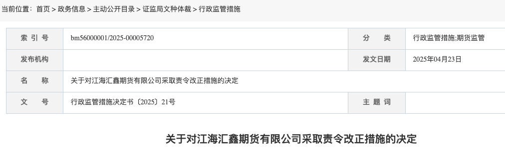 5月8日,根据山东证监局发布的公告,江海汇鑫期货有限公司及分管信息技术的副总经理魏登岳分别被采取责令改正和出具警示函的行政监管措施。
