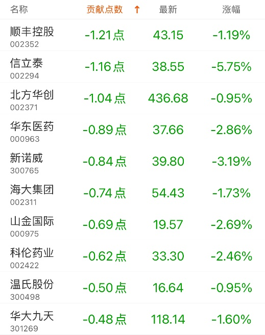 对深证成指贡献点数最多的个股是中航成飞,贡献24.18点,该股当日涨20.01%,收盘价95.86元;拖累点数最多的个股是顺丰控股,拖累1.21点,该股当日跌1.19%,收盘价43.15元。
