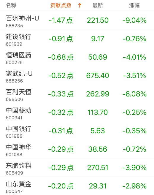 对上证指数贡献点数最多的个股是贵州茅台,贡献0.88点,该股当日涨0.84%,收盘价1604.5元;拖累点数最多的个股是百济神州-U,拖累1.47点,该股当日跌9.04%,收盘价221.5元。