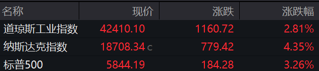 当地时间周一,美股三大指数大幅收涨。纳指涨4.35%,报18708.34点;标普500指数涨3.26%,报5844.19点;道指涨2.81%,报42410.10点。